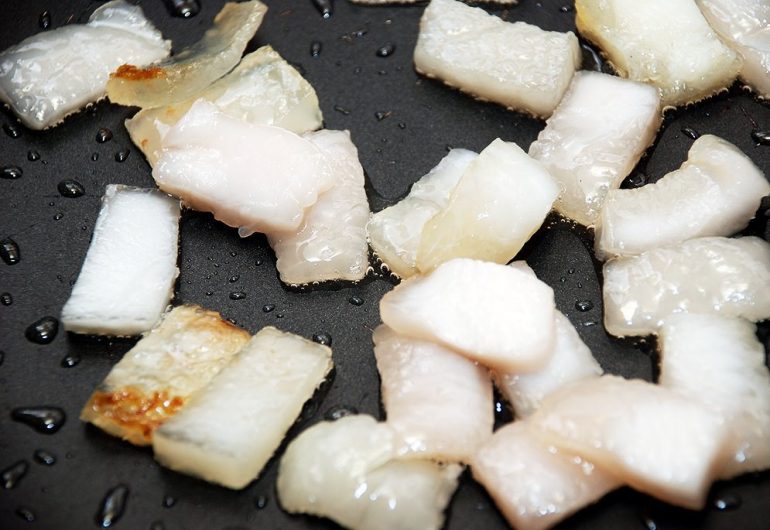 - Сало нарізають кубиками або подрібнюють блендером.