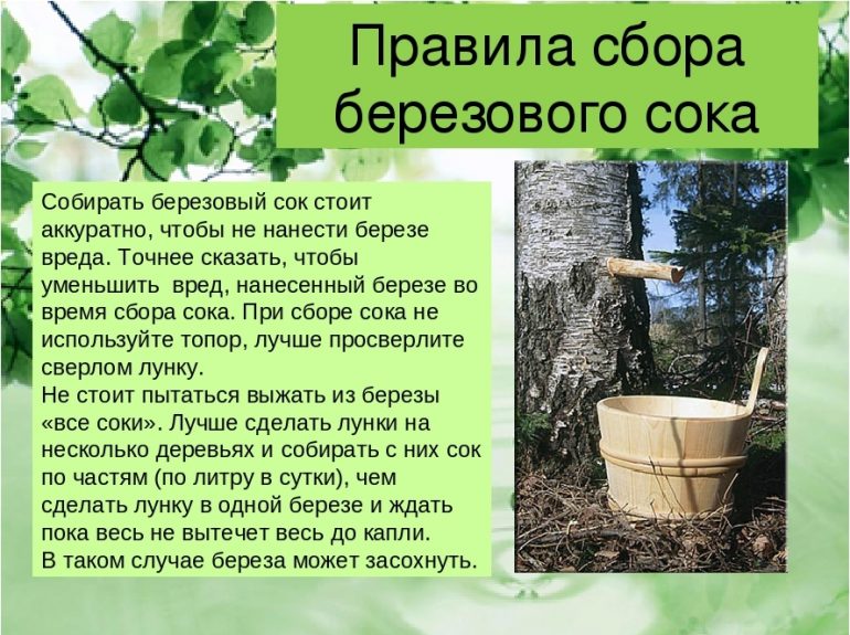 - Сік потрібно збирати з декількох дерев. З однієї берези можна взяти не більше 1 літра соку. В іншому випадку дерево може ослабнути і загинути.