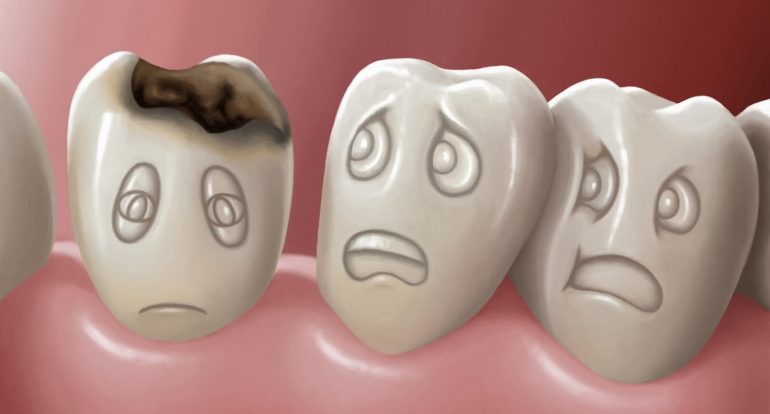 На емаль зубної поверхні постійно впливають кислоти, що містяться в ротовій порожнині. При тривалому взаємодії кристалічна решітка емалі розщеплюється. Утворюється порожнина, чорніючий з часом. Так розвивається карієс.