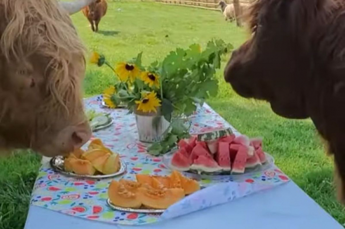 Фермери з Еммета (Айдахо, США) дуже люблять своїх корівок і готові радувати їх пікніками на природі. Вони поставили на стіл частування у вигляді фруктів, прикрасили трапезу квітами і скатертиною. Коли господарі покликали корівок, ті з радістю прибігли, інформує w2w.com.ua.