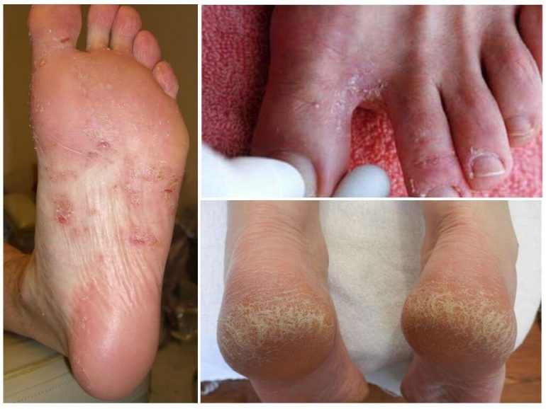 Запущена сквамозно-гіперкератотична форма нагадує поширені потовщені мозолі на підошві з тріщинами. На початку мікоз може проявлятися сухістю, лущенням стоп і обмеженими грубими натоптишами на пʼятах. Багато пацієнтів сприймають ці ознаки як індивідуальну особливість і не звертаються до лікаря. Ураження супроводжується свербежем і печінням. На фото при цій формі помітні глибокі тріщини на тлі потовщеної шкіри стоп, ніби «взуті» в мокасини. Такі зміни болючі. Для сквамозної форми характерне залучення нігтьових пластин з їх руйнуванням і відставанням від нігтьового ложа.