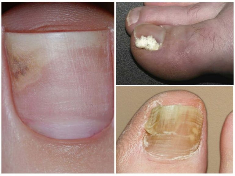 Симптоми посилюються з ростом міцелію. Структура нігтя змінюється: він тьмяніє й стає ламким, пластина вкривається плямами й смугами, відтінок яких залежить від типу збудника. Фото грибка нігтя великого пальця допомагають визначити, який саме мікроорганізм його викликав.