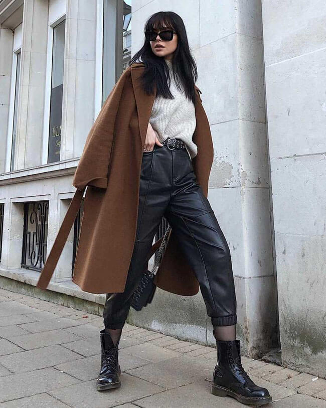 - Узкие леггинсы в обтяжку и теплый кардиган – идеальное решение в сочетании с ботинками на грубой подошве. Леггинсы и грубые ботинки создадут еффект длинных и стройных ног.