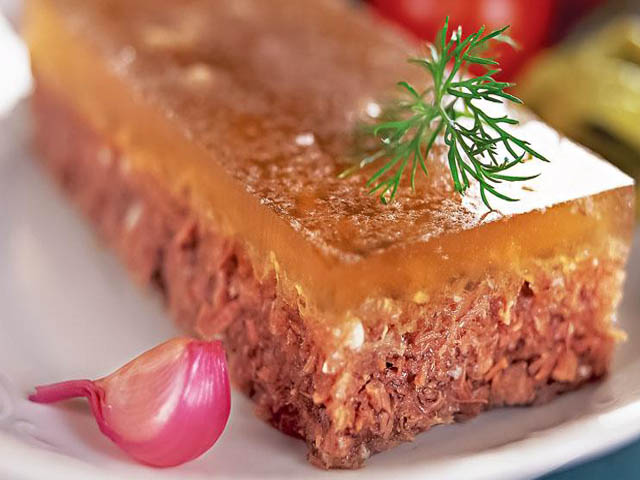 - м’ясо викласти першим шаром, потім залити бульйоном. В цьому випадку вийде два розділених шару. Перший — м’ясний, і другий — у вигляді желе.