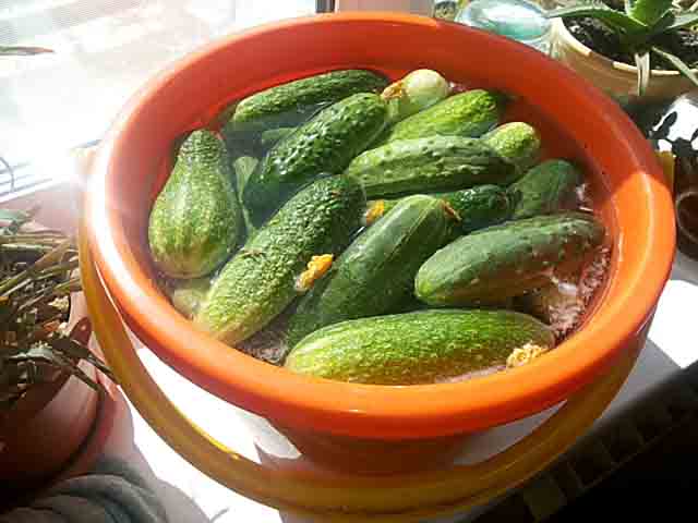 1. Огірки, навіть якщо вони зібрані на своїй ділянці замочити в холодній воді на 4-5 годин. За цей час вони напитаются водою, що згодом зробить їх смачними і хрусткими. Мити перед замочуванням їх не треба.