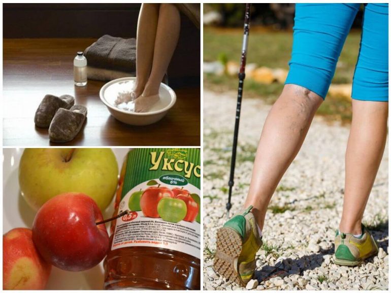 Для ополіскування уражених ділянок потрібно приготувати розчин: у скляній банці змішати 2 склянки яблучного оцту з двома літрами холодної води. Ноги помістити в будь-яку ємність і зрошувати розчином, поки суміш не закінчиться. Потім дати ногам висохнути природним шляхом, піднявши їх. Оцет допомагає відновити втрачену тонусність вен при варикозі на ногах.