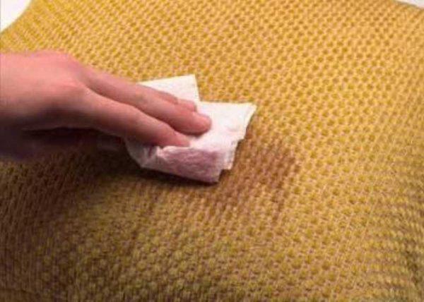 - якщо пляма свіже, то всю вологу з нього важливо прибрати, скориставшись паперовим рушником або серветкою;