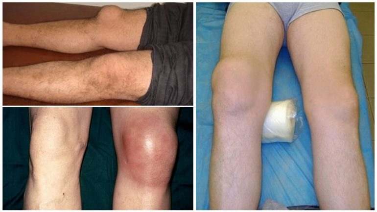 - при значному скупченні рідини — збільшення суглоба в об’ємі і набряк тканин;