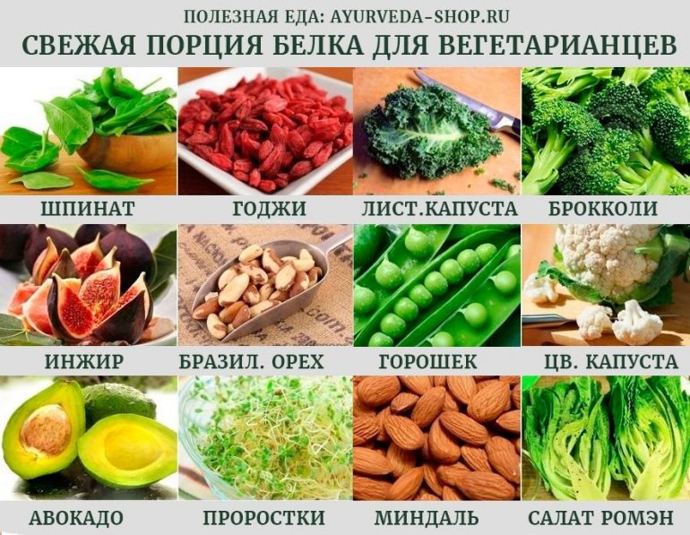 Поповнити запаси білка в вегетаріанської дієти допоможуть такі продукти: брокколі, цвітна капуста, інжир, листовий салат, бразильський горіх, зелений горошок, авокадо. Щоб отримати максимальну дозу білка, знадобиться вживати ці продукти щодня і в досить великій кількості.