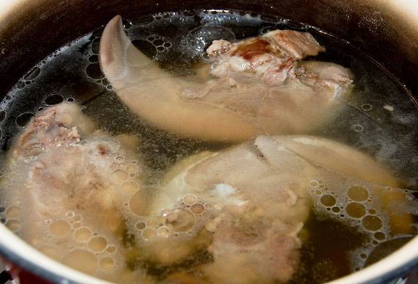 Спочатку субпродукт слід відварити. Процес цей буде тривати довго, близько 4-х годин. Щоб бульйон був чистий, прозорий, першу воду (через 15-30 хв) необхідно злити. Після натерти язик лимонним соком, щоб прибрати запах, і знову опустити в каструлю з вже чистим (другим) окропом. Додати цибулю, моркву, а також дрібку солі, щоб бульйон знайшов прозорість.