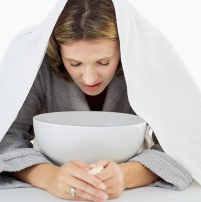 - Ємність з гарячою рідиною поставити на стіл і нахилитися над нею. При цьому голову накрити рушником.