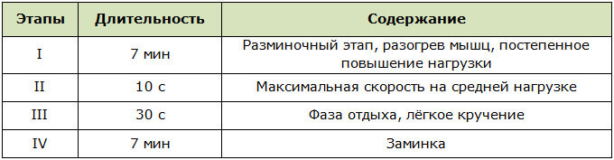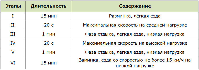 Інтервальне тренування на велотренажері для спалювання жиру називається методом Літтла-Гибала. Другий і третій етапи послідовно виконуються близько 10 разів (залежно від фізичної підготовки).
