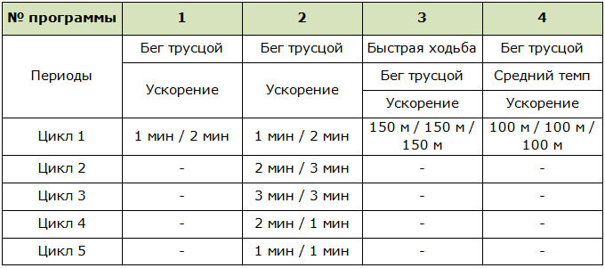 - спринтерські інтенсивні інтервальні тренування — чергування прискореного темпу на межі можливостей і легкої пробіжки;