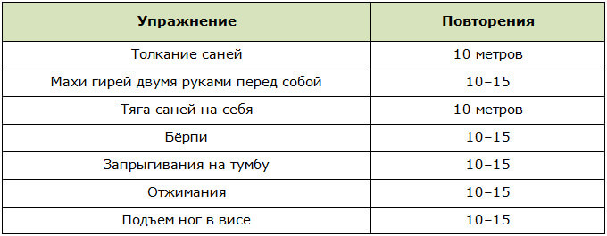 Відмінний варіант для тих, кому набридли звичні комплекси вправ. Перш за все даний тренінг показаний для чоловіків в хорошій фізичній формі. Це ідеальне поєднання кардіо-і силових навантажень. В результаті і м’язи прокачаются, і серцево-судинна система зміцниться. Після того, як весь комплекс вправ виконаний, 2 хвилини відпочинку і — почати спочатку. Кількість кіл — не більше 4-х. Якщо в тренажерному залі немає саней, можна замінити ці вправи на «прогулянку фермера».