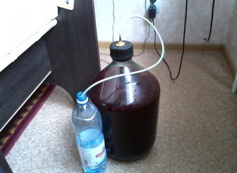 - Розмішують заграв рідини 600 г цукру і поміщають її в спеціальний посудину, з гідрозатворів, для подальшого бродіння.