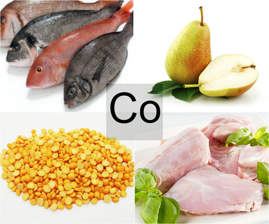 Продукти, що містять кобальт, можна знайти на прилавках будь-якого продовольчого магазина, на ринку і у власному городі. Мікроелемент надзвичайно важливий для нормальної роботи внутрішніх органів, синтезу речовин і загального розвитку. Найбільша його кількість присутній у молюсках, печінці тріски, субпродукти, м’ясі птахів і океанічних риб. Вегетаріанцям варто звернути свою увагу на такі продукти як манна крупа, соя, какао-боби. Поступає в людський організм мікроелемент засвоюється лише частково. Підвищити відсоток всмоктування можна за допомогою вітаміну С, заліза, марганцю і цинку.