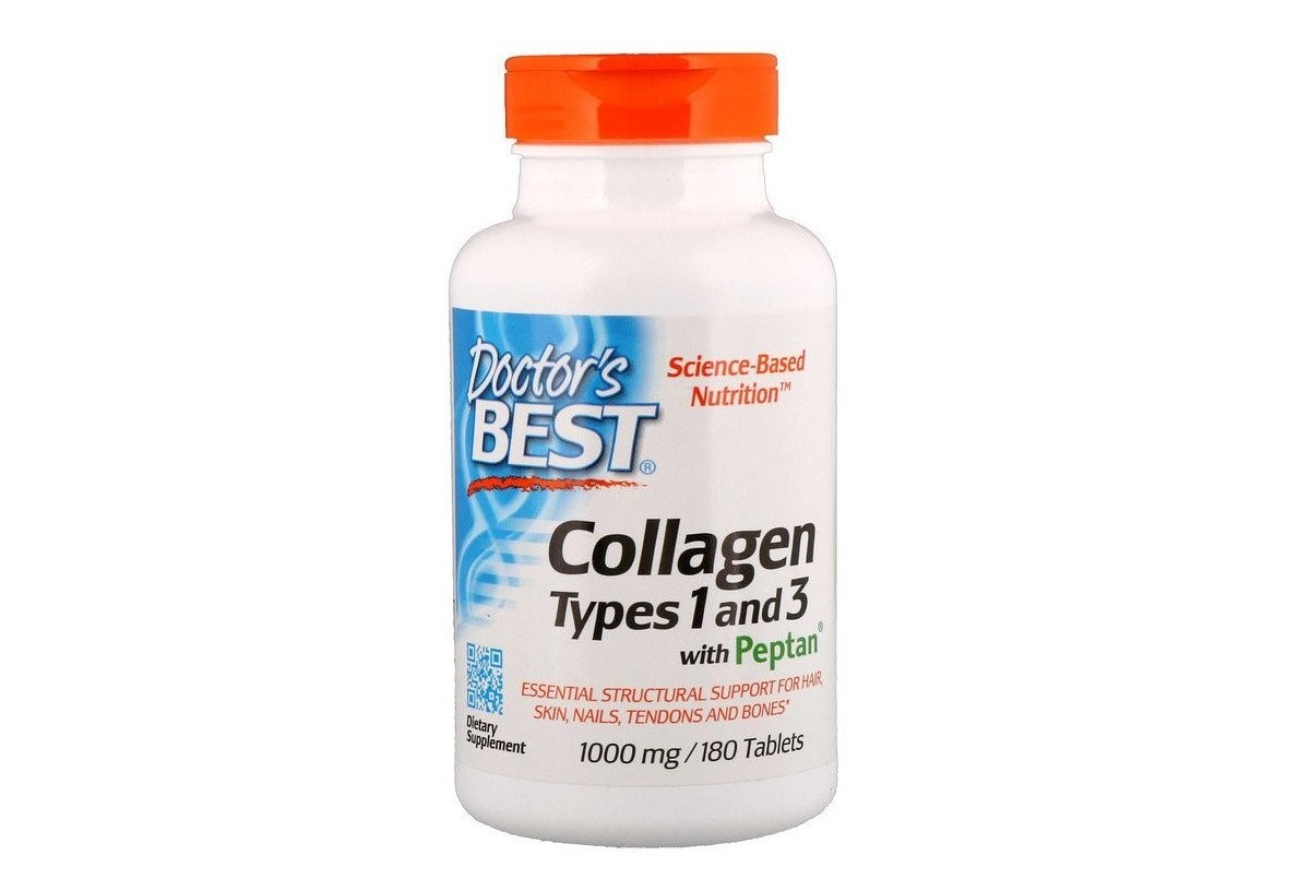 Харчова добавка «Doctor’s s Best, Collagen» з пептидами містить тваринний колаген першого і третього типу. Допоміжні функції виконують кальцій, натрій і вітамін C. Макроелементи надають зміцнювальний вплив на опорно-рухову систему. Завдяки низькій молекулярній вазі пептидів препарат засвоюється швидше. Позитивний вплив на синтез колагену впливає і вітамін C, присутній у складі. Приймають по три штуки двічі в день.