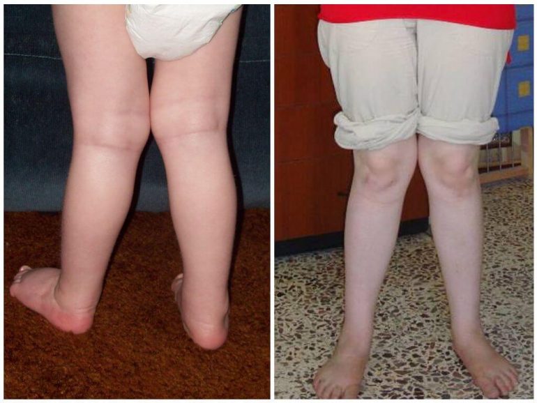 Якщо поглянути на ніжки таких дітей ззаду, видно певне викривлення: гомілка і стопа не утворюють прямої лінії. Між ними з’являється кут, спрямований вершиною всередину, тому нижні кінцівки набувають Х-подібної форми.