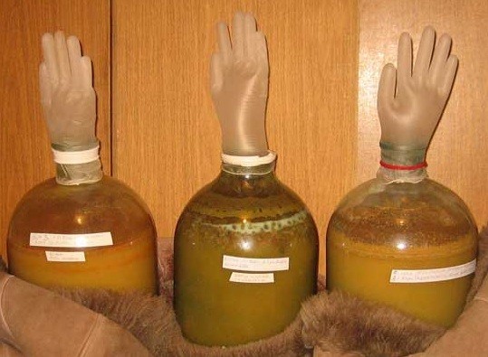 - Після відстоювання зливають рідину, не зачіпаючи осаду на дні. Розподіляють за сухим і чистим банкам, на кожну з яких надягають рукавичку.