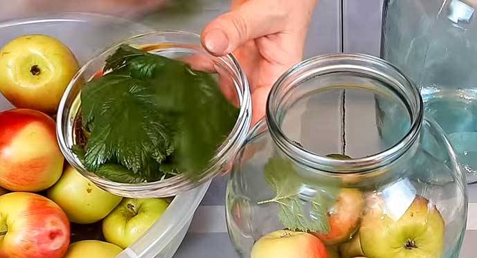 Ще знадобляться яблука, вишневі, м’ятні листя, можна також додати з кущів смородини. Чергуючи шари, заповнюють продезинфіковану тару: на дно укладають промиті листя смородини, потім 2 шари яблук. Накривають вишневими листям і знову плоди в 2 ряди, згори — м’ята.