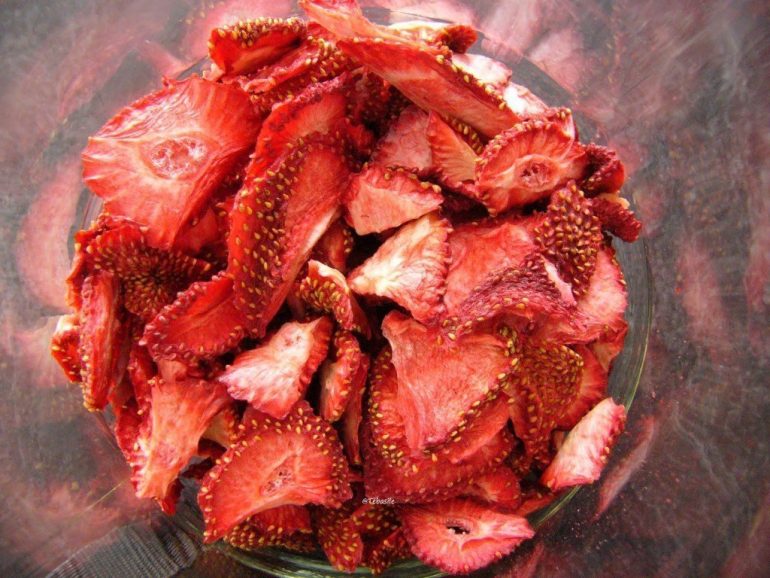 Сушена полуниця дозволяє зберегти практично всі властивості свіжих ягід, оскільки при сушінні, на відміну від заморозки, більшість корисних речовин залишається в них. Користь сушеної полуниці полягає в тому, що мікроелементи, цукру, фолієва і яблучна кислоти зберігаються на рівні 90-100%.