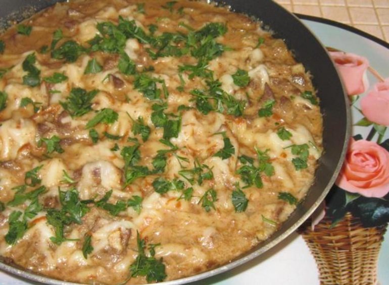 - Сковорода накривається кришкою, потім блюдо тушкують 5 хвилин до готовності.