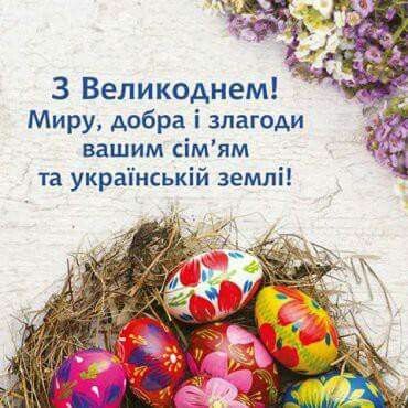 Вітаємо Вас з радісним і світлим весняним святом оновлення, з Великоднем! Нехай в цей святий день Ваше серце буде відкрито Богу, нехай прийдуть в Вашу душу гармонія і тепло. Бажаємо, щоб Ваш будинок наповнився затишком, дзвінким сміхом, щоб тільки добрі вісті приходили сьогодні в Вашу сім’ю, будьте здорові і благополучні.