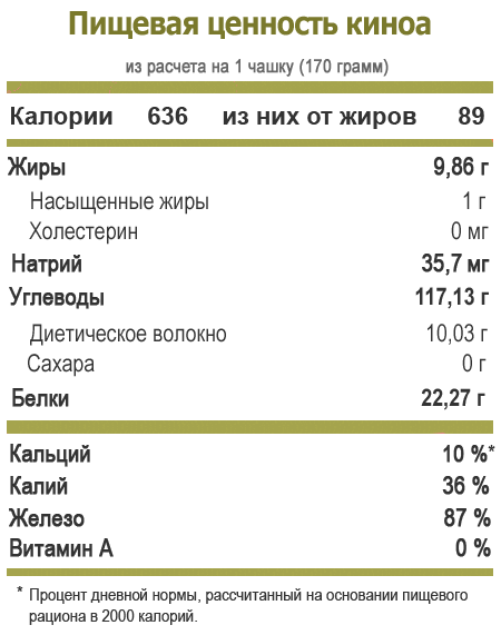 Користь і шкода кіноа вивчені не так добре, як інших круп. Але цей продукт заслуговує більшої уваги. Його склад багатий білком та іншими корисними речовинами, в кілька разів цінніше, ніж у гречки або рису, вівсянки. Рекомендується вживати після операцій, діабетикам, для зміцнення організму, при схудненні, фізичних навантаженнях. Протипоказання – грудне вигодовування.