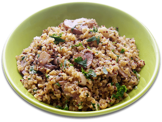 Для приготування каші з грибами знадобиться 1 стакан крупи, 200 грам печериць, цибулина, 2 ложки масла, спеції за смаком. Цибулю з грибами обсмажують, потім вмішують у готову кашу.