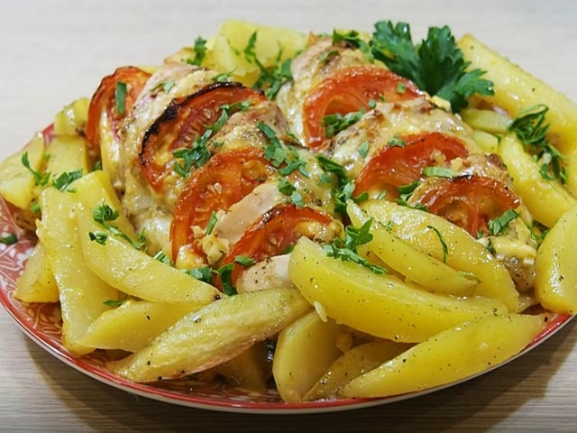 Курка з помідорами і сиром, запечена з картоплею