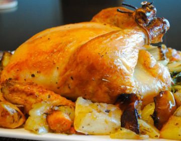 - У форму викладіть курячу тушку, навколо викладіть картоплю, яблука. Випікайте 1,5 години в духовці (попередньо розігрійте її до 200 градусів).