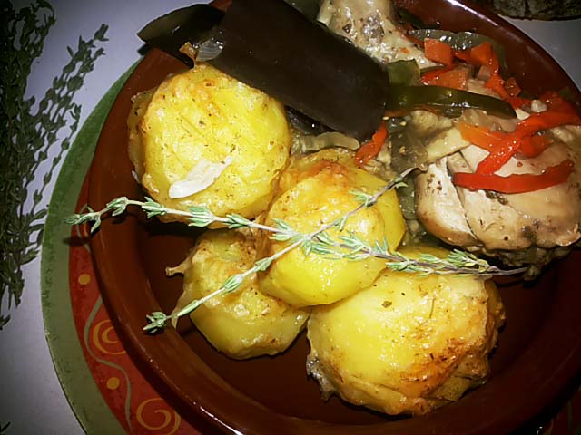 14. Тим часом вже приготувалися курка з овочами. Так що можна подавати. Викладаємо картоплю, намагаємося не поламати «гармошку» і тушковану курку з овочами.