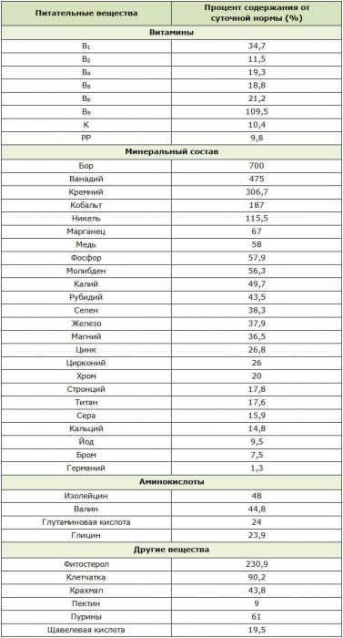Відрізняється високим вмістом вітамінів, мінеральних елементів, білків, амінокислот, клітковини, фітостеролів, крохмалю та пуринів.