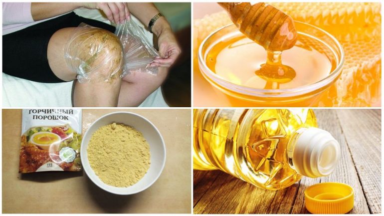 - У рівних частинах змішати мед, порошок гірчиці і рослинну олію. Довести до кипіння і охолодити. Просякнений розчином шматок марлі прикласти до суглоба на два години.