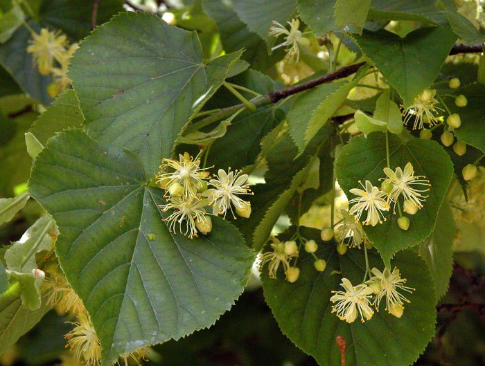 - біло-жовті липові квітки, зібрані в суцвіття, разом з приквітковим листами;