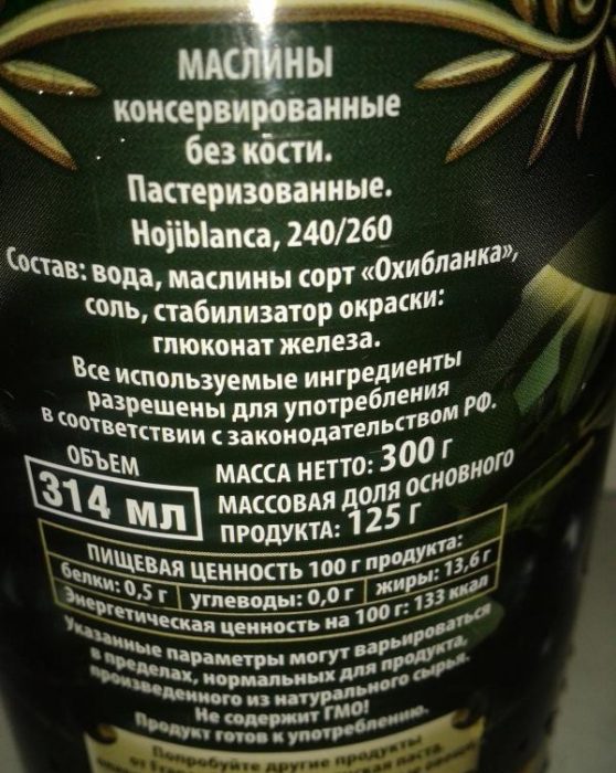 При виборі маслин слід ознайомитися з етикеткою на банку, де можна побачити яким способом були заготовлені чорні маслини і принесуть вони користь чи шкоду організму. Якщо на етикетці псевдопродукта буде вказана один з видів харчових добавок або барвників, то такі маслини краще не купувати.