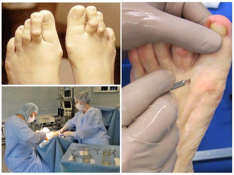 - Корекція молоткоподібного пальця може виконуватись шляхом резекції міжфалангового суглоба. Під час операції видаляють і натоптиш, що викликає біль. Палець вирівнюють і фіксують спицею на місяць. Якщо одночасно є вальгусне відхилення, його оперують у відповідний спосіб.