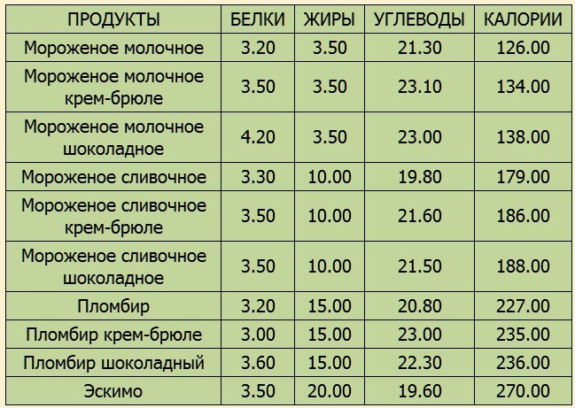 Склад і калорійність морозива