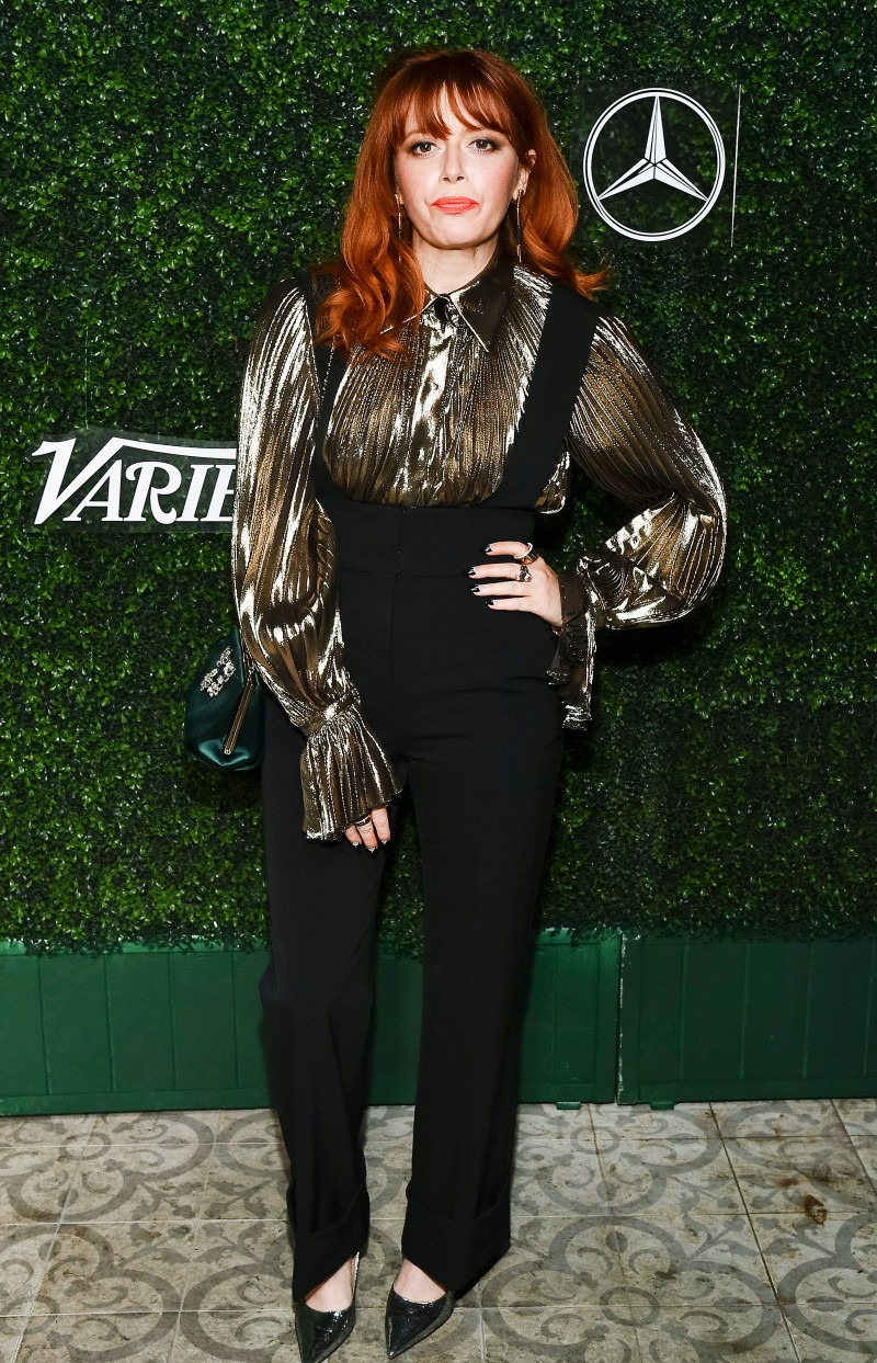Знаменитість виглядала витончено в шовковій металевій сорочці і брюках на вечері Showrunners в Лос-Анджелесі 17 вересня 2019 року.