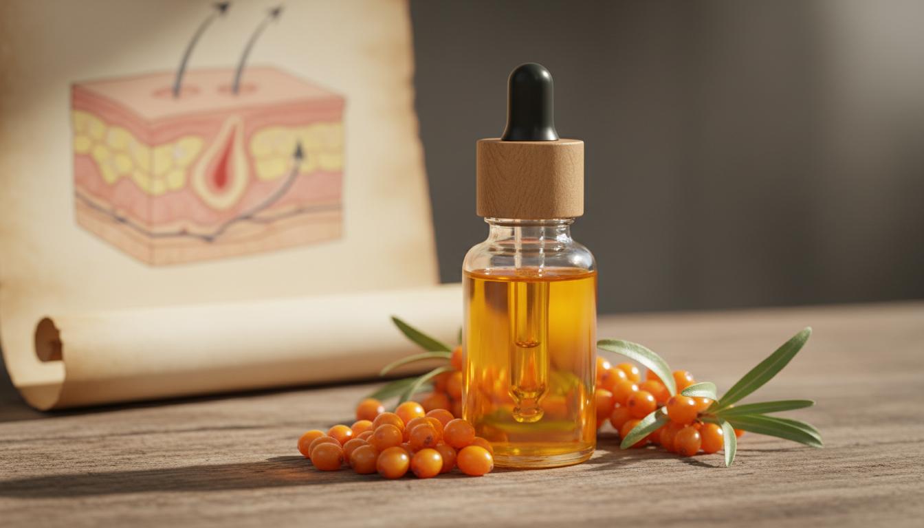- Олія багата антиоксидантами (вітаміни С і Е) та омега-3, -6 і -7, які зволожують шкіру і зменшують ознаки старіння. Омега-7 (пальмітолеїнова кислота) стимулює вироблення ліпідів шкіри, покращуючи її еластичність.