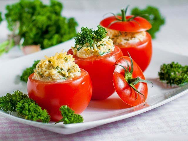 Фаршировані помідори дуже смачна і популярна закуска для будь-якого свята. Вона відповідає всім параметрам святкового столу — вона яскрава і барвиста, готується легко і просто, і звичайно ж вона смачна! До того ж фарширувати помідори можна самими численними способами. Важко знайти продукт, з яким би не поєднувався помідор.