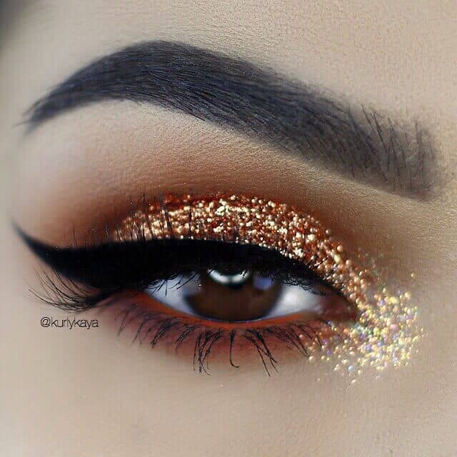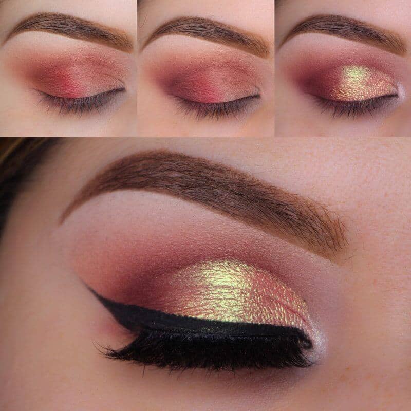 Цей макіяж обов’язково приверне увагу людей до вашим очам. Жирний лайнер, золоте мерехтіння на верхньому столітті і рожеві з золотом мтени в складці.