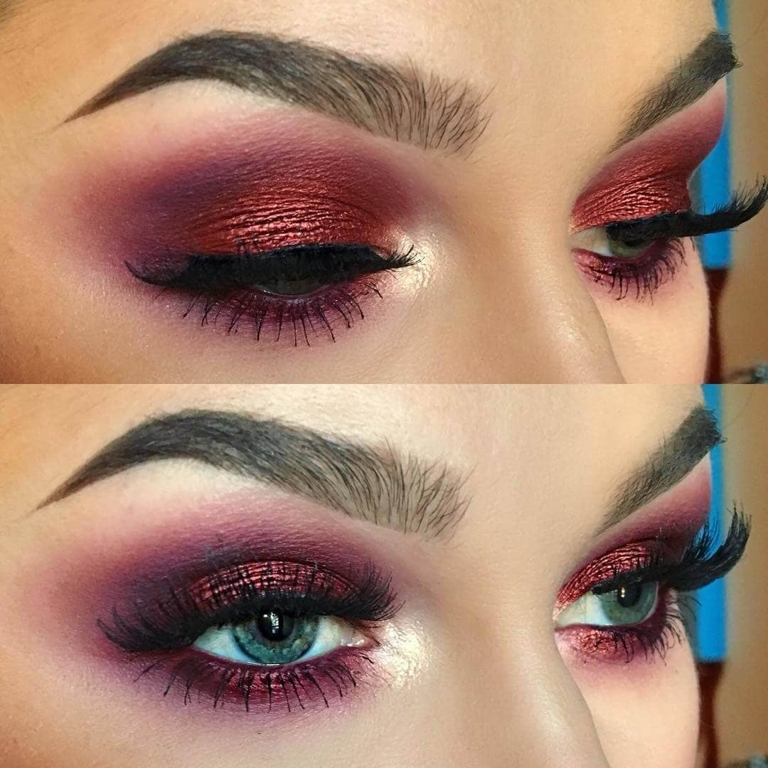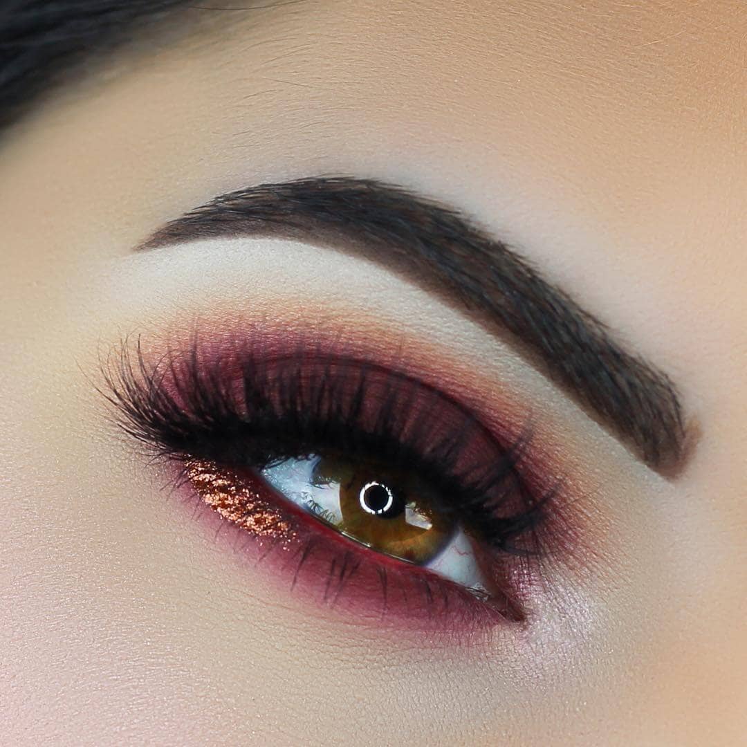 Золоті мерехтливі тіні на верхньому столітті і бордовий відтінок у складці можуть викликати буду виглядати максимально ефектно.