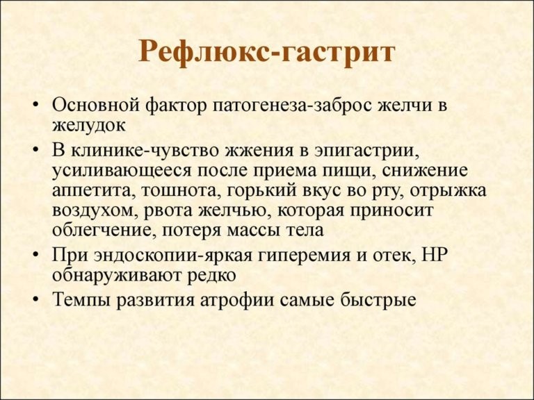 При біліарному рефлюкс-гастриті біль з’являється не завжди, а тільки після сильного стресу, фізичних навантажень або переїдання. У деяких випадках безпричинно з’являється кашель. Це говорить про те, що вміст потрапляє в стравохід. Якщо не проводити лікування і не дотримуватися дієти при рефлюкс-гастриті, то стан пацієнта погіршиться — виникне некробіоз, з’являться ерозії.
