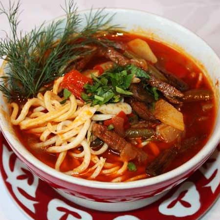 Відмінною особливістю є те, що це блюдо готується переважно з баранини, овочів і саморобної витягнутої локшини.
