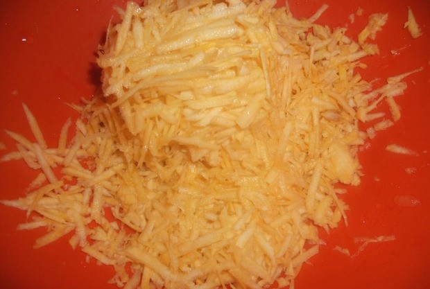 - Кілька невеликих коренеплодів як слід миють, очищають їх від жорсткої шкірки і ріжуть тонкими смужками. Також можна ріпу натерти на крупній тертці.