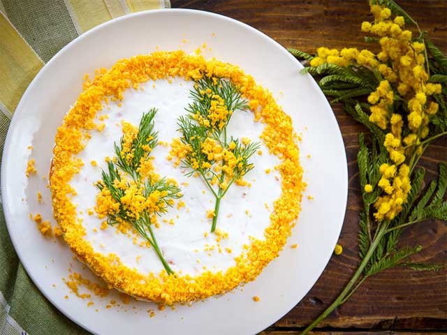 Поверхня «Мімози» покривалася подрібненим жовтком, що було порівняно з однойменною квіткою. Всім відомо, що він розквітає ранньою весною і часто є подарунком до восьмого березня.