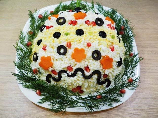 Трохи я помилилася з білої тарілкою, біле на білому кілька загубилося. Треба було брати темну. Але це можна виправити, виклавши гілочки кропу, як новорічні ялинові лапи. А за ним, при бажанні розкидати зернятка граната.