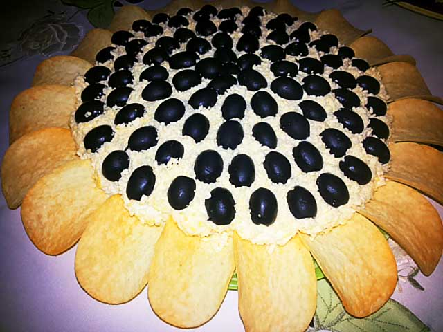 6. Викладаємо по колу нарізані на половинки маслини. Це у нас «насіння» соняшника, тому розташовуємо їх у відповідному порядку. Кожну половинку злегка придавлюємо, щоб вона добре трималася.