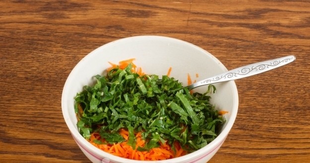 - Вимиту і висушену бадилля дрібно порубати, моркву потерти на крупну тертку.